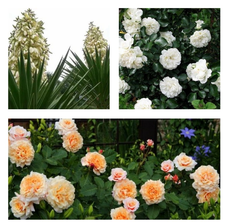 Комплект саженцев Розалия (юкка Алоэлистная, роза кустовая Альба Мейяндекор, роза кустовая Карамелла)