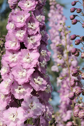 Новозеландский дельфиниум Центурион Пинк (Centurion Pink) очарует вас своим насыщенным ароматом и великолепным цветением. Его цветки окрашены в нежный пудрово-розовый оттенок, который местами переходит в лавандовый, создавая выразительный контраст с белой серединкой. Цветки имеют необычную, пушистую форму благодаря густо расположенным лепесткам, что придает им особую декоративность. Высокие и пышные колосья, состоящие из множества бутонов, украшают крепкие прямостоячие кустарники, достигающие высоты более 150 сантиметров.